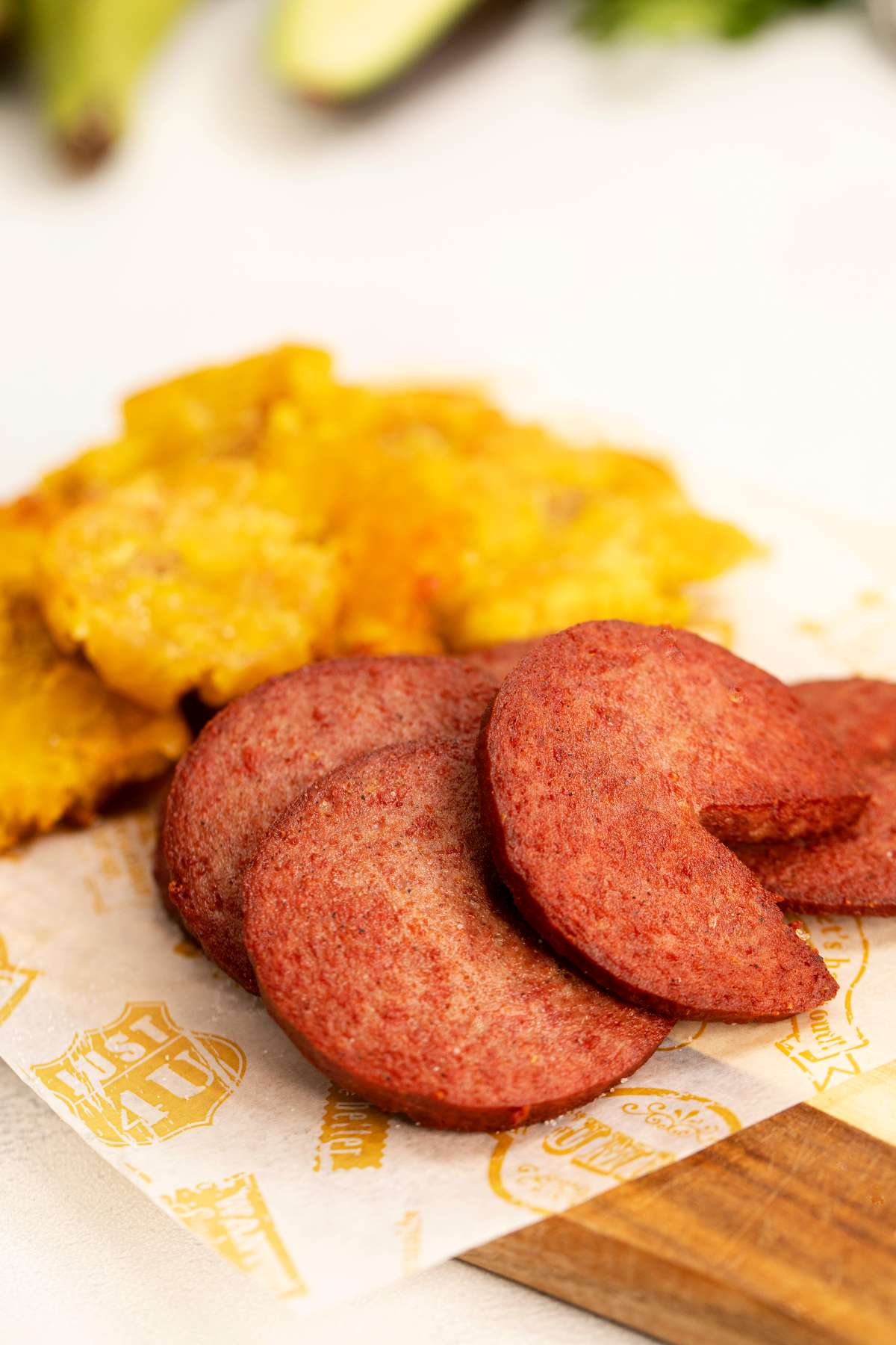 The Dominican Classic! Some fried plantains and Dominican Salami.